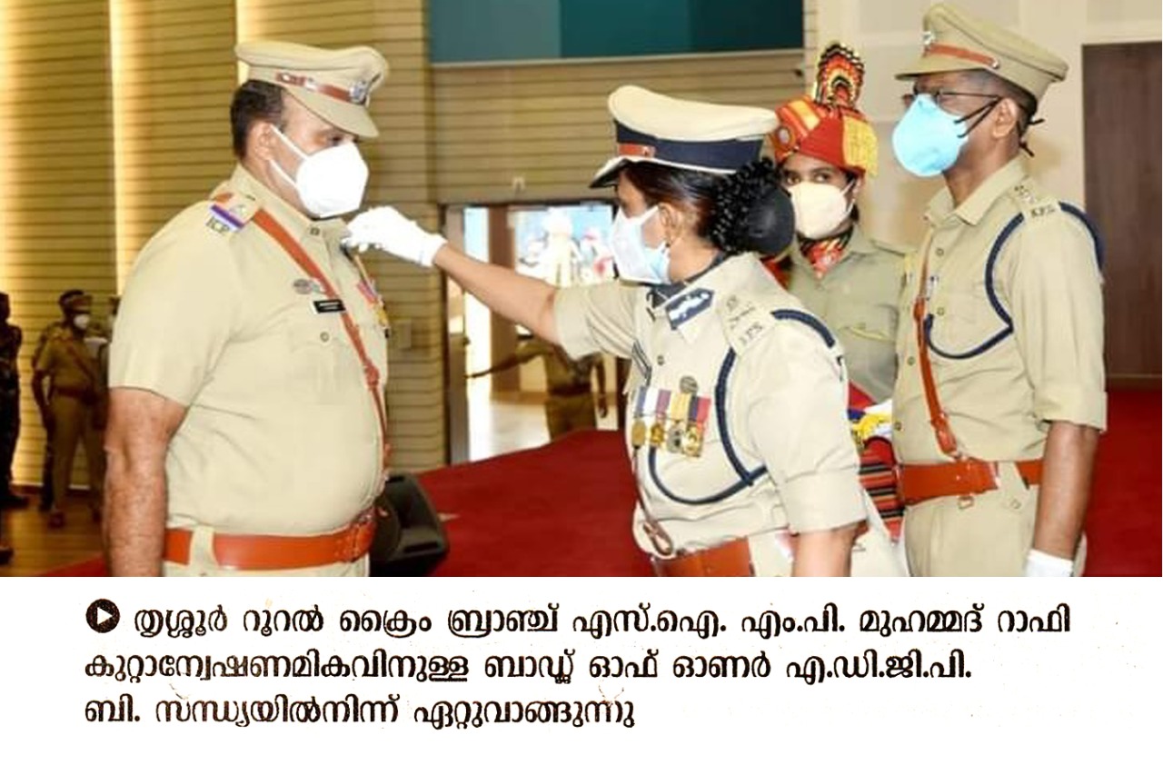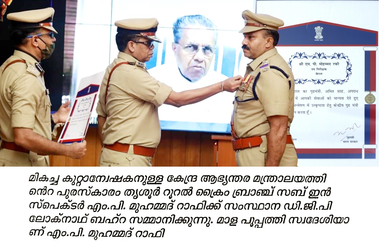 Thrissur Rural Crime Branch Sub-Inspector M.P. Mohammad Rafi was awarded the award of the Central Home Ministry for the best detective. State DGP Loknath Bahra presented the award.